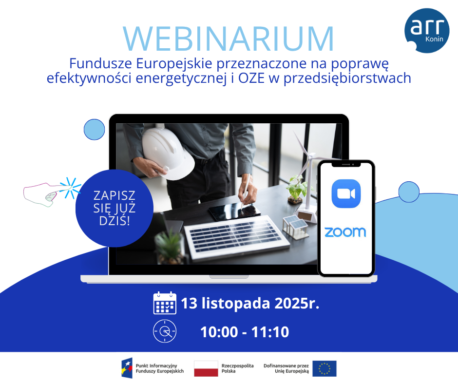 Punkt Informacyjny Funduszy Europejskich w Koninie zaprasza na bezpłatne webinarium „Fundusze Europejskie przeznaczone na wsparcie efektywności energetycznej i OZE w przedsiębiorstwach”.